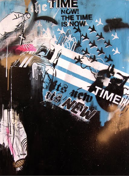 Santiago trabaja principalmente en el plano, para lo cual utiliza todas las ticónicas relacionadas con el arte callejero, stickers, stencil, graffiti, etc.
